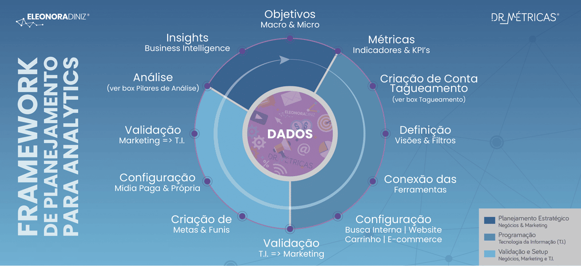 No início do framework, falamos sobre Macro e Micro conversões e na sequência falamos das definições de métricas, indicadores e KPI ́ s. Esses levantamentos são necessários para cadastrar as metas que serão acompanhadas via Google Analytics. É possível que existam casos em que as metas precisam ser acompanhadas por sistemas internos da empresa ou por outros softwares de mercado. O importante aqui é ter controle de todas as metas que precisam ser monitoradas para saber se o negócio está indo bem ou não.