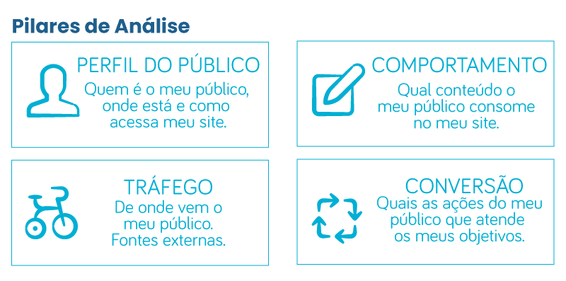 Todos os passos do framework foram justamente especificados para chegarmos neste momento com uma qualidade de dados que nos permita fazer análises muito mais assertivas e capazes de gerar bons insights. Temos 4 pilares de análise: