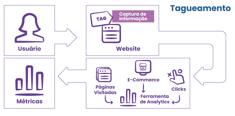 Antes de iniciar o tagueamento, é necessária a criação da conta no Google Analytics (G.A). Ao final do processo de criação da conta, o G.A. exibe o código de propriedade (Universal Analytics – U.A) do website juntamente com o código de tag de página que precisa ser inserido em todas as páginas do website. Para aplicativos, é necessário utilizar o firebase, e nele é gerado o arquivo sdk (esse dados poderão ser vistos no GA4 – nova versão do Google Analytics) O arquivo SDK – Software Development Kit, que deverá ser incorporado ainda no desenvolvimento do app, para que as capturas aconteçam e sejam direcionadas para o Firebase e consequentemente no GA4.